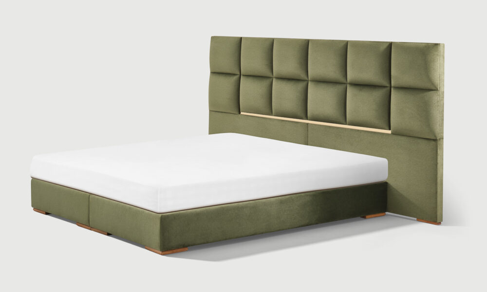 GODDESS vous invite à des grasses matinées encore plus confortables ! Le lit GODDESS sublimera votre chambre à coucher avec sa tête de lit en velours traité anti tâches et son piètement en hêtre massif.