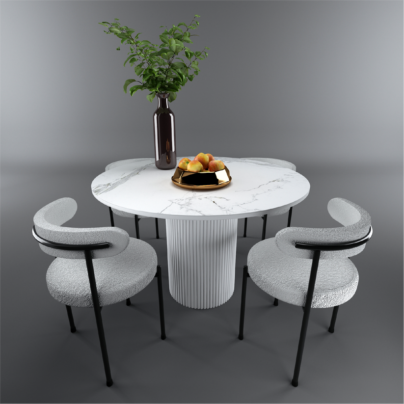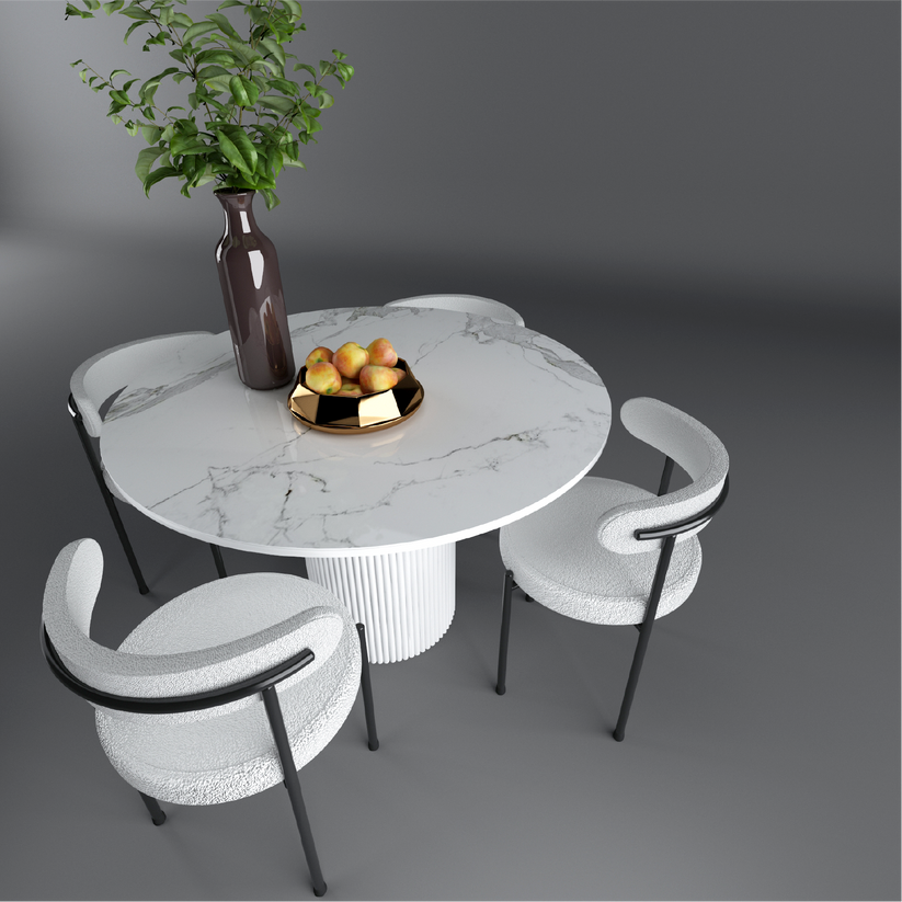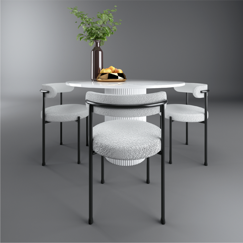 Transformez votre espace de vie en une œuvre d’art moderne et élégante grâce à notre toute dernière création : une table à manger ronde assortie de quatre chaises en métal et tissu bouclette, une exclusivité signée VECTORIA.